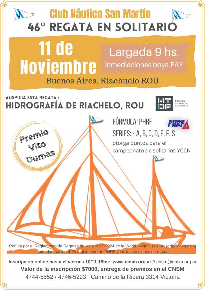 El sabado 11 del corriente se corre la tradicional regata de solitarios a Riachuelo, organizada por el Club Nautico San Martin. Una muy buena oportunidad para aquellos que deseen cruzar el charco y probar las aptitudes de cada uno para iniciarse en estas lides-